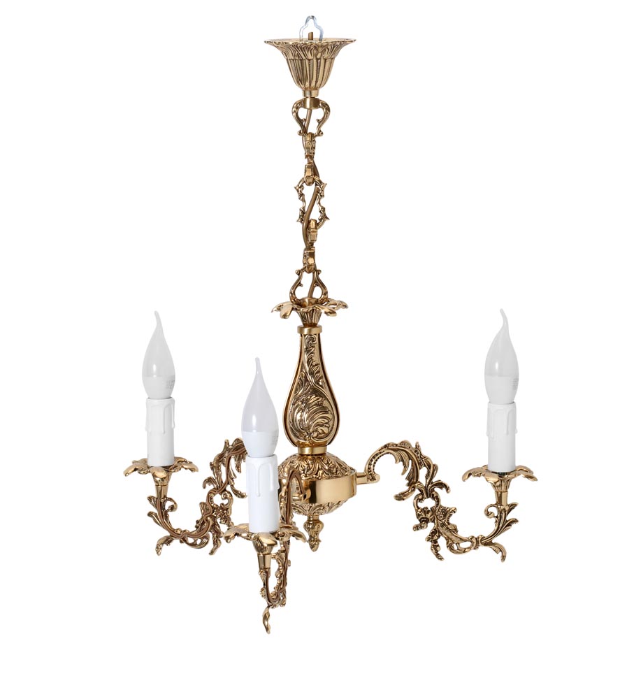Elegancki żyrandol z mosiądzu trójramienny w wersji świeczkowej nadający się idealnie do każdego pomieszczenia.